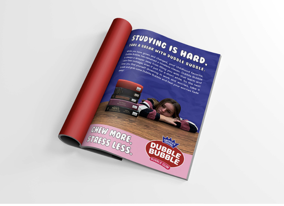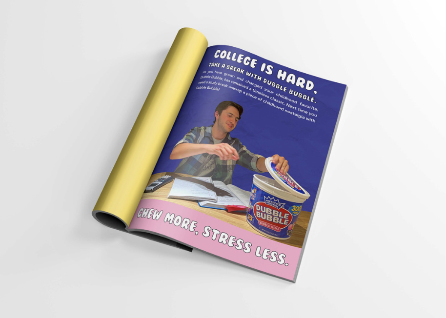 Featured is the project worked on in my final capstone class at James Madison University. My group members, Kyle Wedemeyer, Logan Boilen, and Katherine Snare and I worked on this campaign for Dubble Bubble all semester long. We were tasked to find a brand that currently does not market itself much and to create a comprehensive campaign for that company. Our deliverables include, print, video, guerrilla marketing, out-of-home, and social media advertisements.