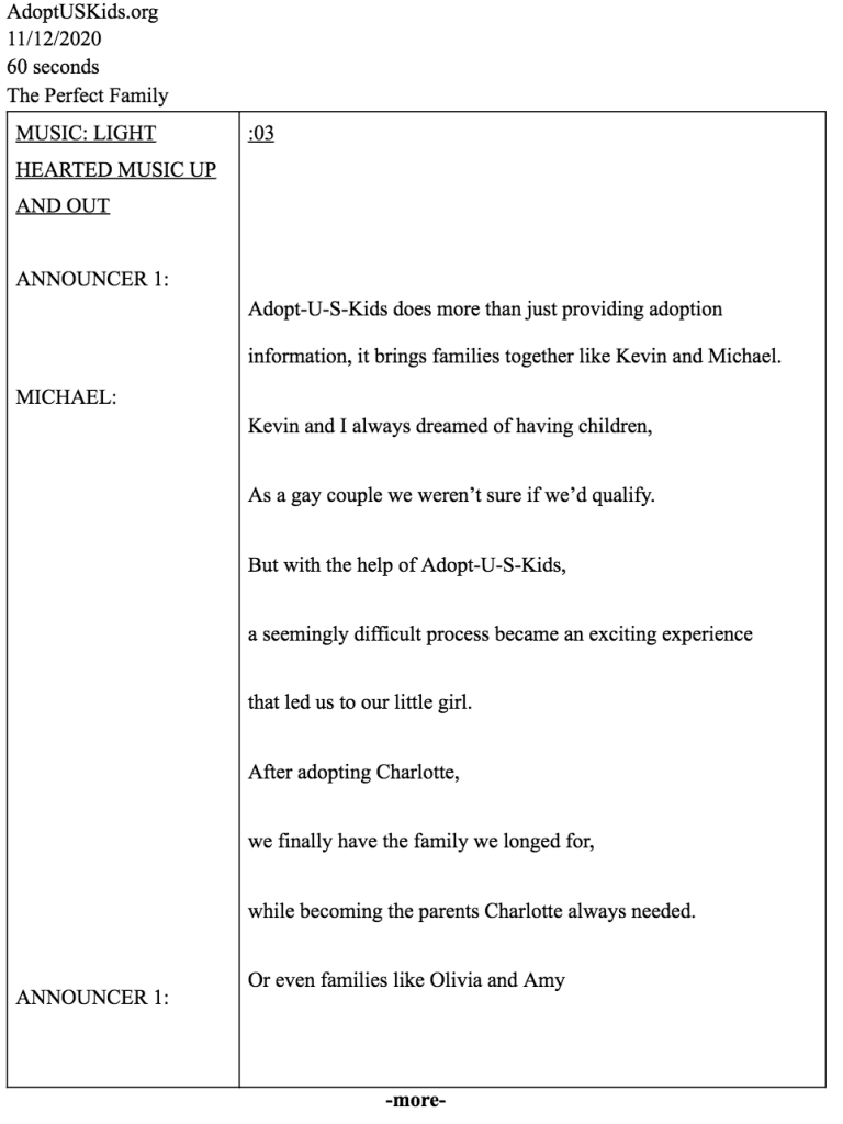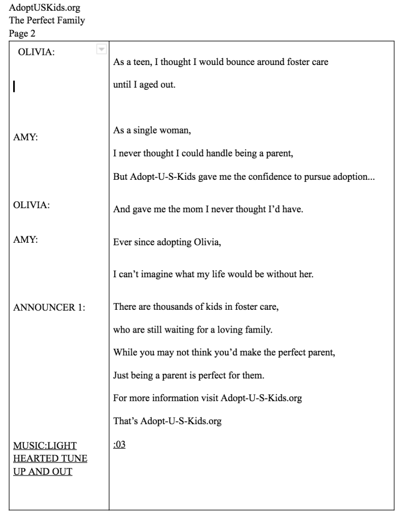The radio advertisement was made for AdoptUSKids. The objective of the advertisement was to show diversity in those who are willing to adopt. The client wanted us to frame a situation where a child would need to be adopted and emphasize that AdoptUSKids has the resources to help anyone who is thinking of adopting. A main focus was to explain the successes that people from Virginia have with adopting children from the foster care system. The advertisement was a 60 second radio advertisement tailored to potential adopters.