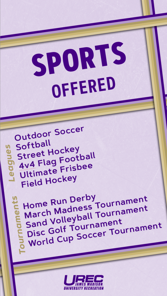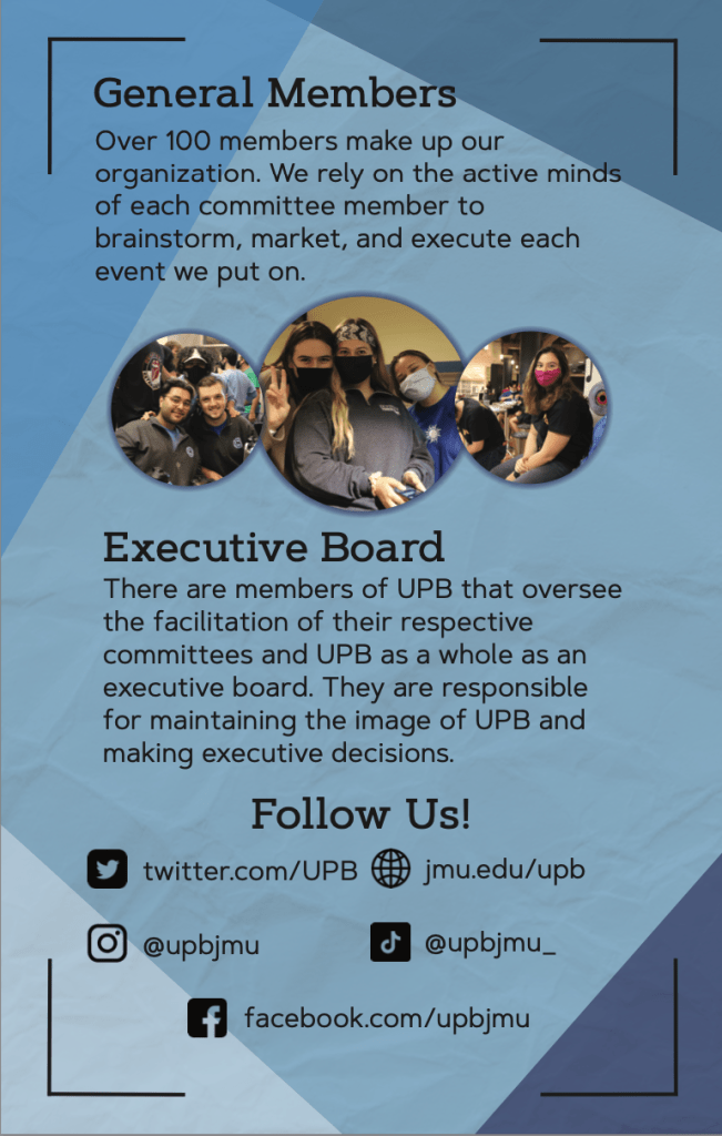 Work that I have recently done for the University Recreation Center (UREC) at James Madison University as a Marketing Assistant and as the Vice President of Marketing for the University Program Board (UPB).